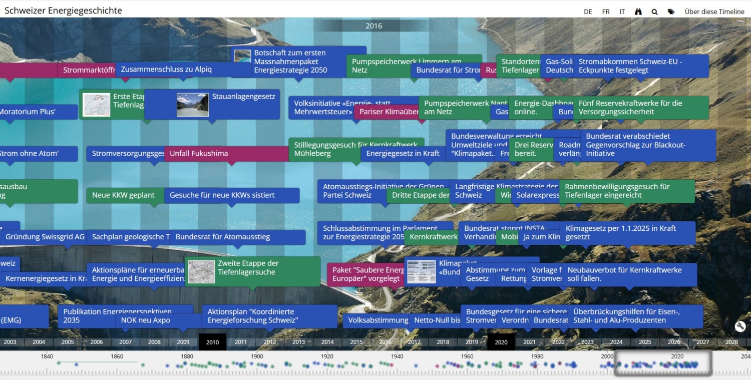 Der Zeitstrahl startet mit dem Bau des ersten Gaswerkes in der Schweiz 1843. Die Einträge sind in drei Kategorien – Internationales, Infrastruktur und Politik – aufgeteilt. Zu jedem Eintrag gibt es weiterführende Informationen mit Links, Quellenangaben oder Bildern. Mit der Suchfunktion kann auch gezielt nach Themen gefiltert werden. Das Tool ist in den drei Sprachen Deutsch, Französisch und Italienisch aufbereitet. Die Sprache kann man in der Taskleiste oben wählen.