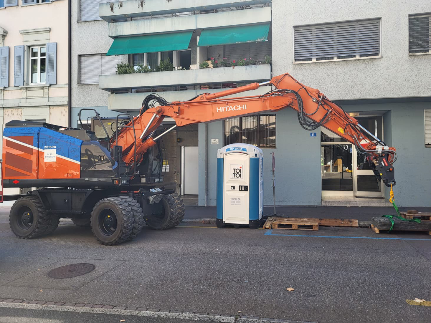 ZE150W: So heisst der elektrische Mobilbagger, der auf den Pilot-Baustellen in Basel und in Luzern im Einsatz steht. Dieser Bagger ist mit Rädern statt Raupen ausgestattet. Er ist damit flexibler einsetzbar als ein Raupenbagger und kann mit der entsprechenden Zulassung auf öffentlichen Strassen fahren und so verschiedene Baustellen verbinden.