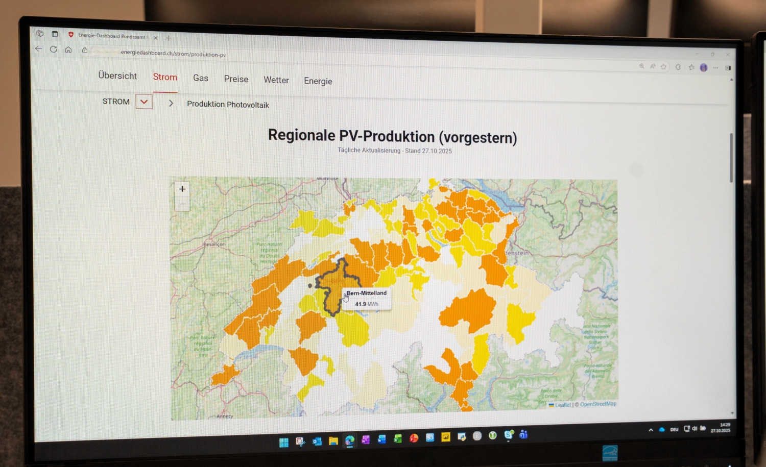 Wo produziert die Sonne wieviel Strom? Das Energiedashboard des Bundesamts für Energie (BFE) zeigt neu die regionale Tagesproduktion in stündlicher Auflösung. Das Tool liefert zudem auch eine Fünf-Tages-Prognose in stündlicher Auflösung.