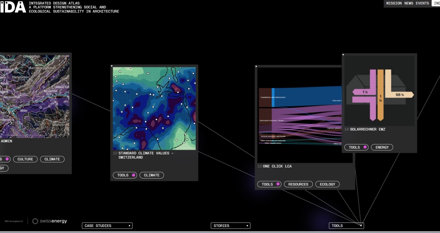 Die Inhalte wurden gezielt zusammen gestellt und ihre Verbindungen untereinander visualisiert, sodass Zusammenhänge leicht erkennbar werden. IDA gliedert sich in vier Bereiche. Die Case Studies präsentieren „good practice“-Projekte mit Plänen, Bildern und Beschreibungen. In der Toolbox finden Nutzerinnen und Nutzer digitale Werkzeuge, die sie direkt im Entwurfsprozess einsetzen können. Stories liefern vertiefende Beiträge zu den Case Studies und Tools, während die Community den fachlichen Austausch, Diskussionen und Informationen zu Veranstaltungen ermöglicht.