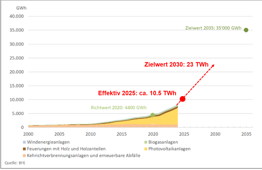 Die Ziele sind ambitioniert, aber mit den neuen Rahmenbedingungen des Bundesgesetzes für eine sichere Stromversorgung mit erneuerbaren Energien machbar. Der dazu nötige Zubau von 2.5 TWh pro Jahr wird voraussichtlich im Jahr 2025 mit etwa 2.2 TWh schon fast erreicht.